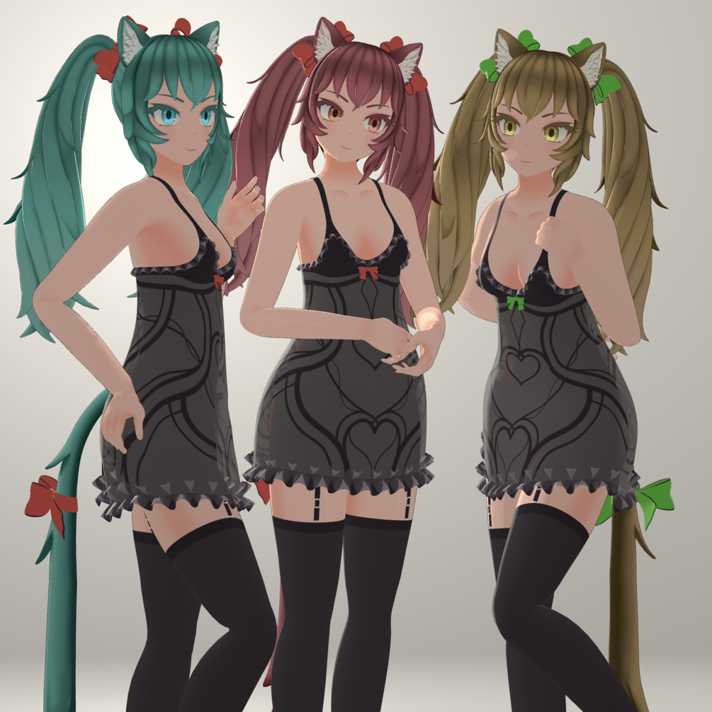 Introducing Kali! Our OC Catgirl and mascot of VRC group Lastation, this initial release gives you a cute nightie as well as our custom Loco System so even if you dont have full body tracking you can still sit down, and pose in all sorts of ways!